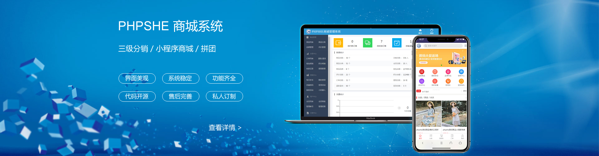 提供一站式快速構建網上商城、三級分銷商城、多用戶商城,適配小程序(微信、支付寶、百度、頭條)/H5/APP等終端,